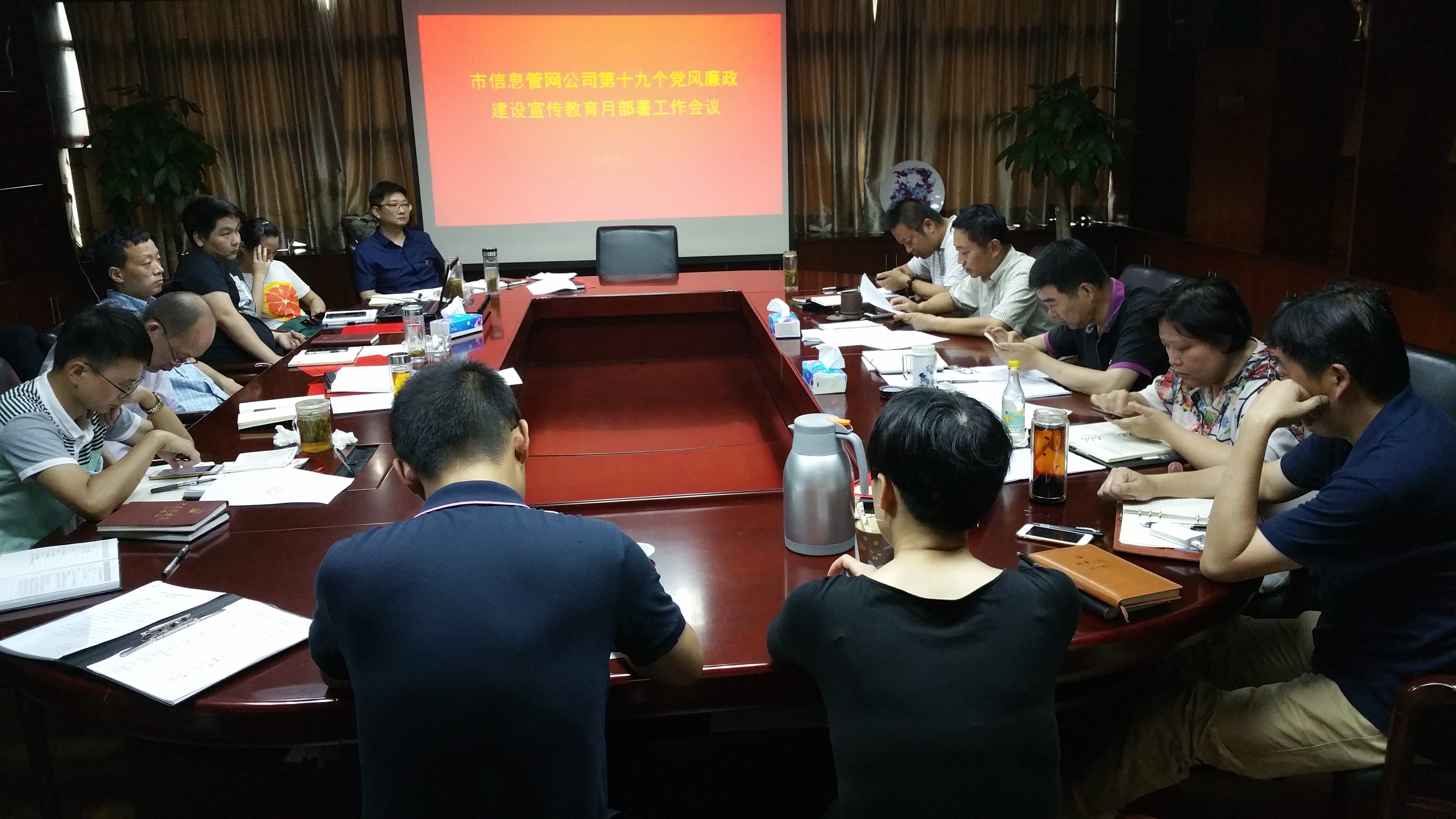 會議傳達了城投集團公司黨委《第十九個黨風廉政建設宣傳教育月活動的通知》(武城投黨〔2018〕55號)文件精神;宣傳部署了《市信息管網公司黨委第十九個黨風廉政建設宣傳教育月活動實施方案》(武信投黨〔2018〕24號),并重點部署了“五個一”活動安排。