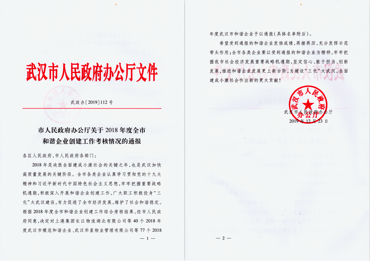 近日,武漢市人民政府辦公廳發(fā)文通報了2018年度全市和諧企業(yè)創(chuàng)建工作考核情況,市信息管網(wǎng)公司榮獲2018年度武漢市“模范和諧企業(yè)”榮譽稱號。