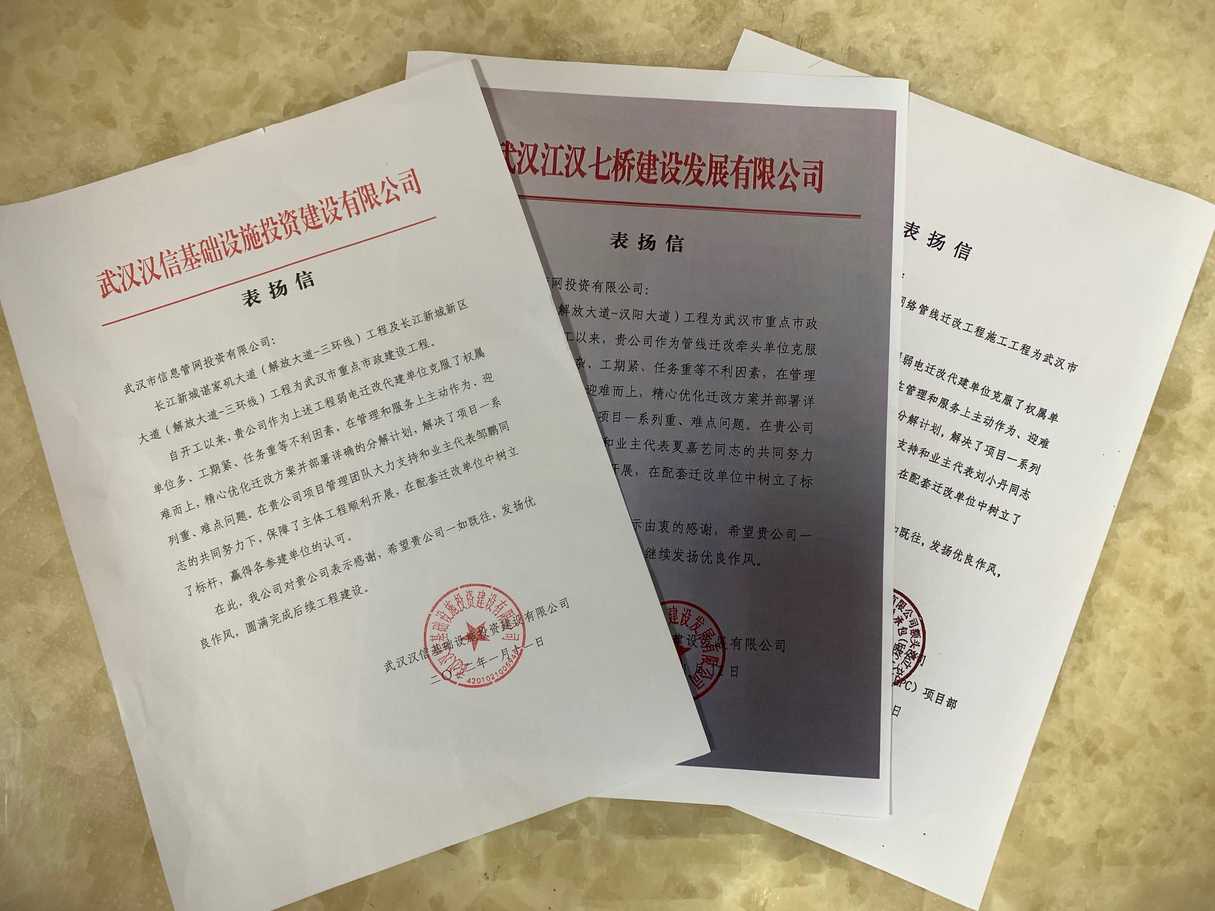 近日,市信息管網(wǎng)公司收到武漢漢信基礎(chǔ)設(shè)施投資建設(shè)有限公司、武漢江漢七橋建設(shè)發(fā)展有限公司和武漢市市政建設(shè)集團(tuán)有限公司額頭灣立交改造工程項(xiàng)目部發(fā)來(lái)的表?yè)P(yáng)信,肯定我公司在長(zhǎng)江新城諶家磯大道(解放大道-三環(huán)線)、江漢七橋(解放大道-漢陽(yáng)大道)和額頭灣立交項(xiàng)目上取得的成績(jī)。