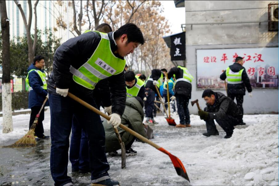 近日,武漢市一場冰凍雨雪給市民出行造成嚴重影響,為落實上級關于應對雨雪冰凍天氣會議精神,公司黨委組織20余名黨員和入黨積極分子成立“黨員先鋒隊”,在清掃完單位周邊積雪的同時,129日,積極響應市、區文明辦的號召,深入到共建社區開展義務鏟雪除冰勞動。